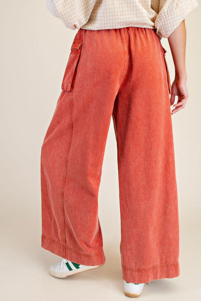 Shake things up with the Lets Salsa Pant—a washed striped twill that's ready to move with you. This wide-leg wonder features a mineral-washed finish and textured stripes for effortless style, while the high-waisted elastic waistband keeps everything comfortable and secure. The relaxed, loose fit pairs perfectly with side cargo pockets and flap details for that laid-back vibe. Full length and totally versatile, these pants are your new go-to for casual days that demand a little personality.