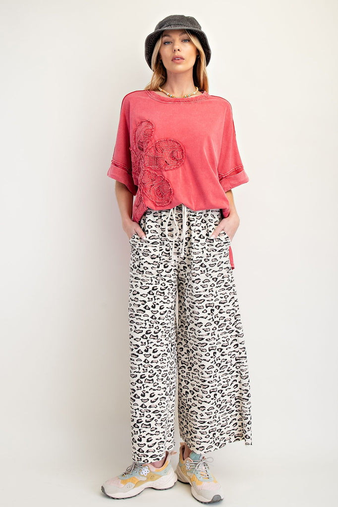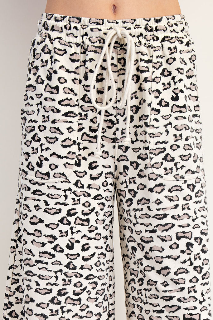 Get in touch with your wild side with these animal print mineral washed terry knit pants. Made with a stretchy, relaxed, and loose fit, these pants also feature front pockets, a smocked waistband with drawstring closure, and a wide leg silhouette. The raw cut hem adds an extra touch of edginess.