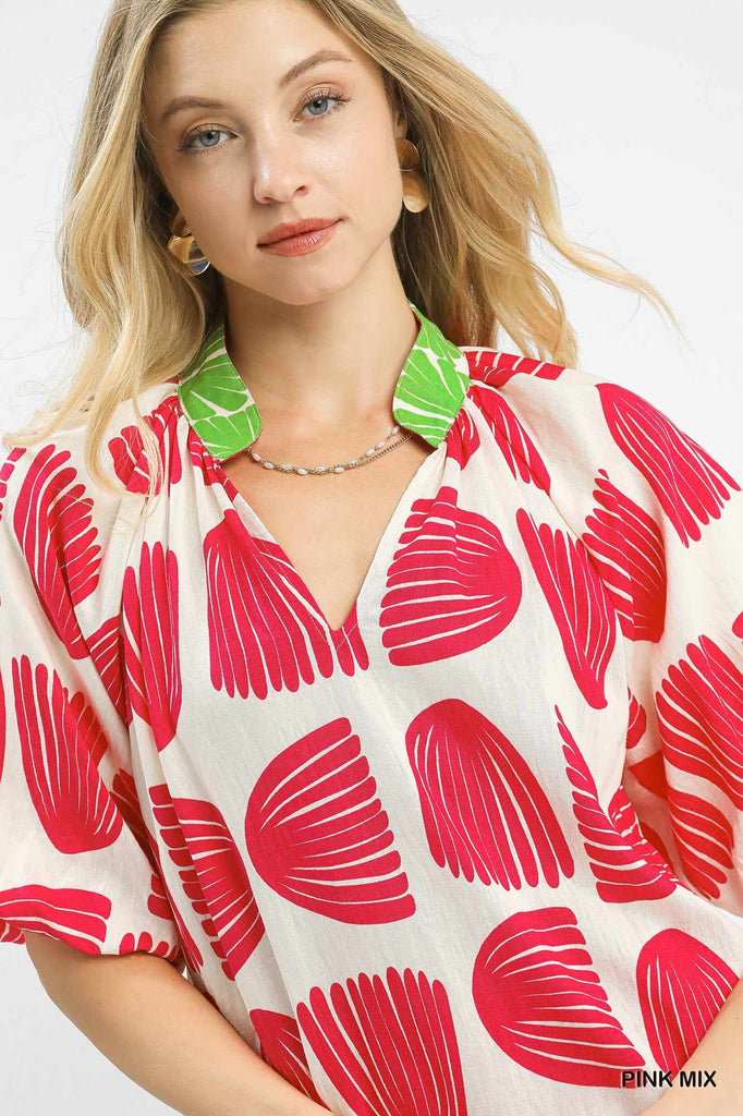 Add a splash of fun to your wardrobe with this Bright Statement Top. Featuring a charming V-neckline and playful puff ¾ sleeves with elastic cuffs, it’s designed for comfort and style. The bold Shell Block Boarder Print and scalloped edges give it a unique, eye-catching look, while the relaxed, flowy fit keeps you feeling light and breezy all day long. Perfect for days when you want to stand out with ease!