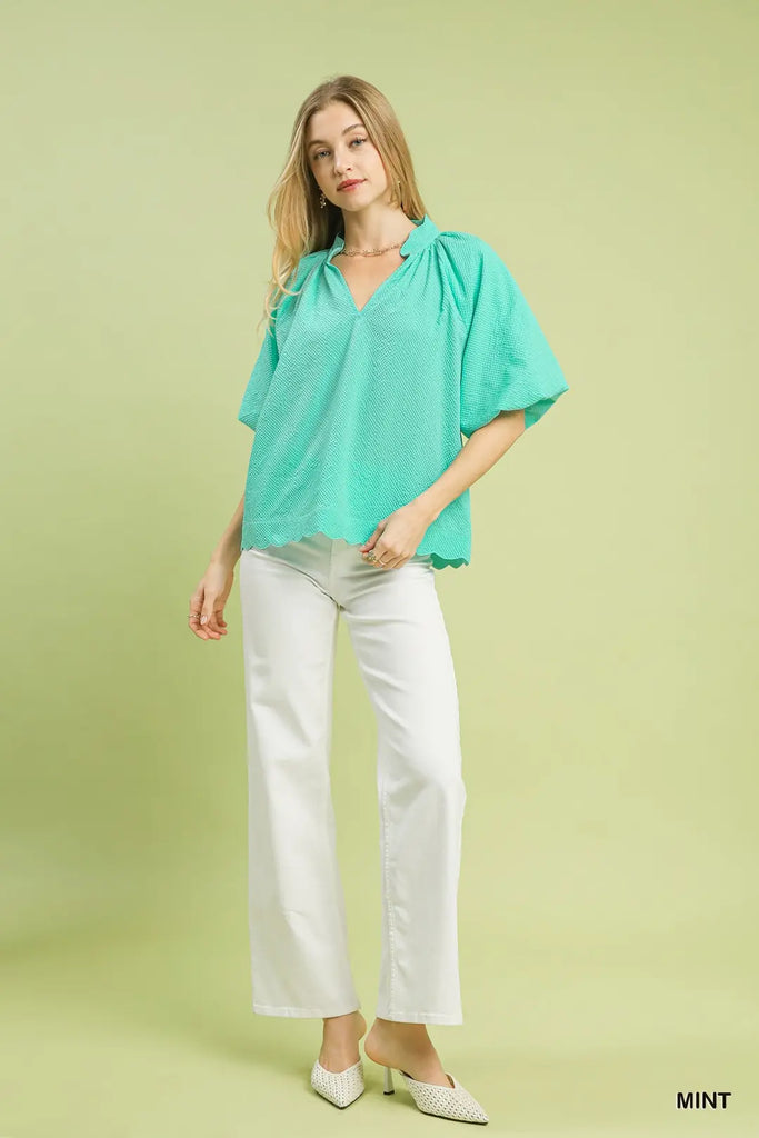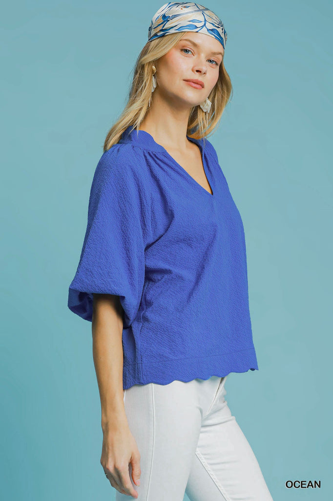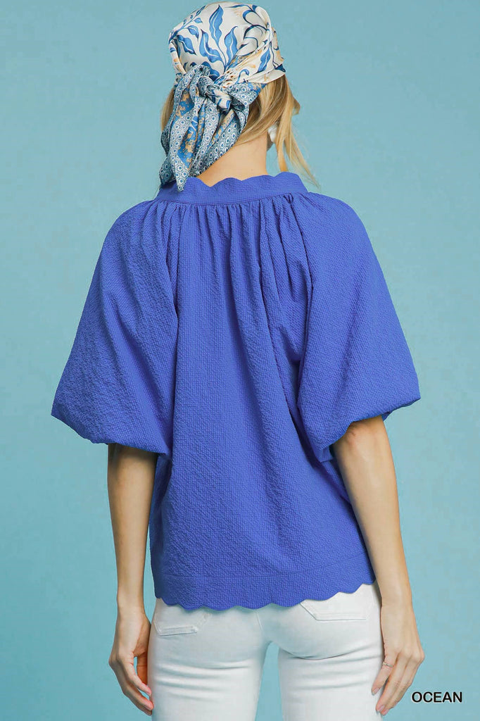 Introducing the Scallops Top—a playful twist on classic summer style! This charming seersucker piece features adorable bubble sleeves that add instant personality, paired with a delightfully scalloped hemline for extra flair. The breathable seersucker fabric keeps you cool and comfortable, while the lined sleeves ensure a polished look. Perfect for brunch dates, casual outings, or whenever you want to make a lighthearted fashion statement. A fun, flirty essential that brings joy to your wardrobe.