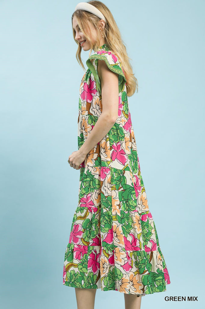 Twirl into spring with this charming tiered midi dress that's bursting with personality. The notched V-neck features delicate contrast scallop trim that adds a touch of whimsy, while flutter sleeves keep things breezy and fun. Layered tiers create beautiful movement and dimension, perfect for dancing through your day. The contrast trim details tie the whole look together with unexpected flair. Unlined for lightweight comfort—ideal for warm weather adventures.