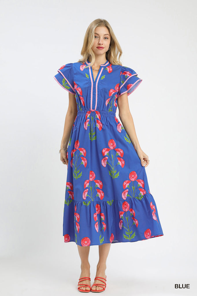 Blossom Meadow Dress features a charming floral print with a flattering split V-neck trimmed in contrasting fabric. The midi silhouette pairs perfectly with short puff sleeves that layer contrasting details for added dimension. An elastic waistband ensures comfortable wear, while the lined skirt provides coverage and movement. Ideal for garden parties, casual outings, or any occasion calling for effortless style.