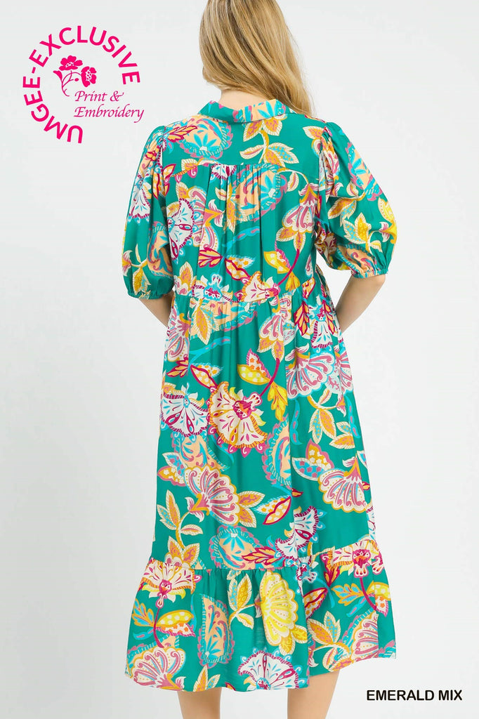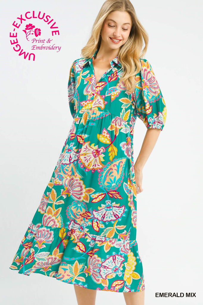 Twirl through your day in this Garden Highlight Dress, where bold paisley florals dance across every inch of fabric. The split V-neck with charming collar detail frames your face beautifully, while relaxed 3/4 sleeves with elastic cuffs keep things effortlessly chic. A tiered hem adds movement and playfulness to the flowy silhouette, perfect for everything from garden parties to casual outings. Fully lined for comfort and confidence. Pure joy in dress form.
