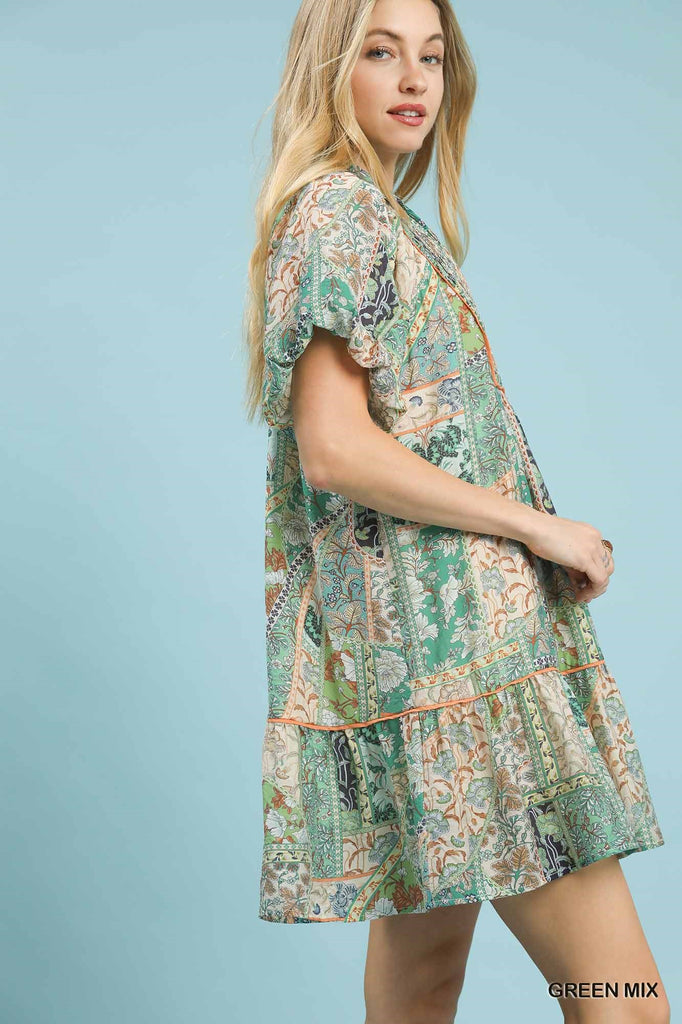 Small Town Dress features a vibrant multi-color patchwork print with boho charm. The smocked front and ruffle-trimmed neckline create romantic detail, while flutter sleeves and tiered mini skirt with contrast piping add playful movement. Fully lined for comfort and confidence.
