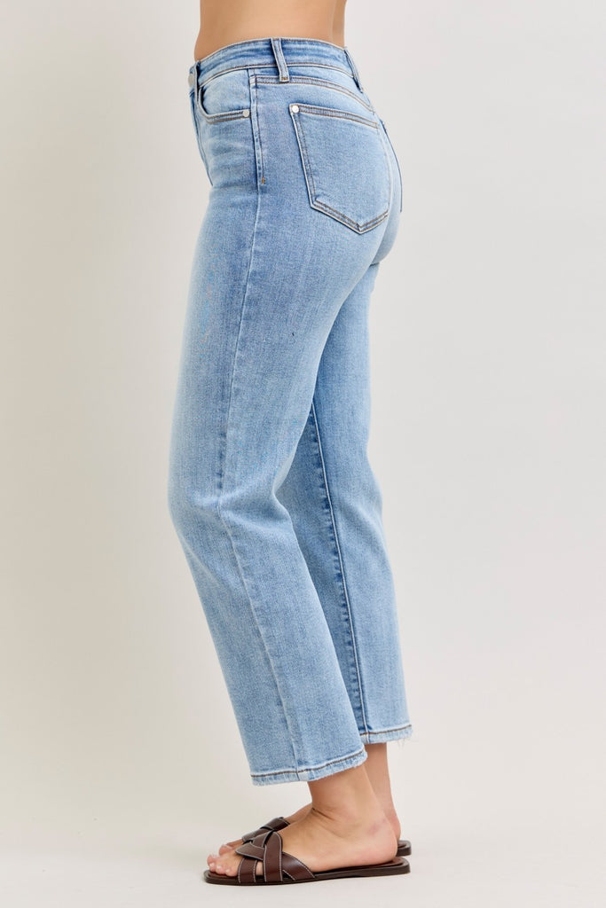 These jeans, high-waisted for a contemporary look, feature a light wash for a casual, laid-back vibe. The straight cut ends at the ankle, making them perfect for showcasing your favorite footwear. Carefully designed to be both trendy and comfortable, they're made for hand washing to maintain their quality. Experience the blend of timeless appeal and modern twist with our HW Ankle Straight jeans.