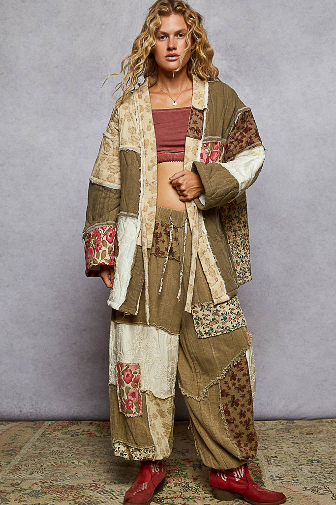 Slip into something wonderfully different. These Autumn Changes Pants blend cozy double gauze fabric with a roomy, relaxed fit that feels like a warm hug. Patchwork panels and contrast patches create an artfully mismatched vibe—each pair tells its own story with unique stitch detailing and vintage flair. The accented drawstring waist keeps everything perfectly in place while you embrace comfort and individuality. Perfect for those who'd rather stand out than blend in. Matching top available,