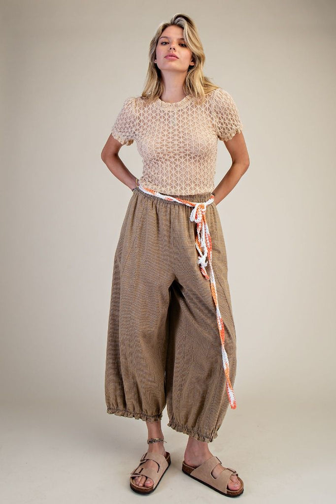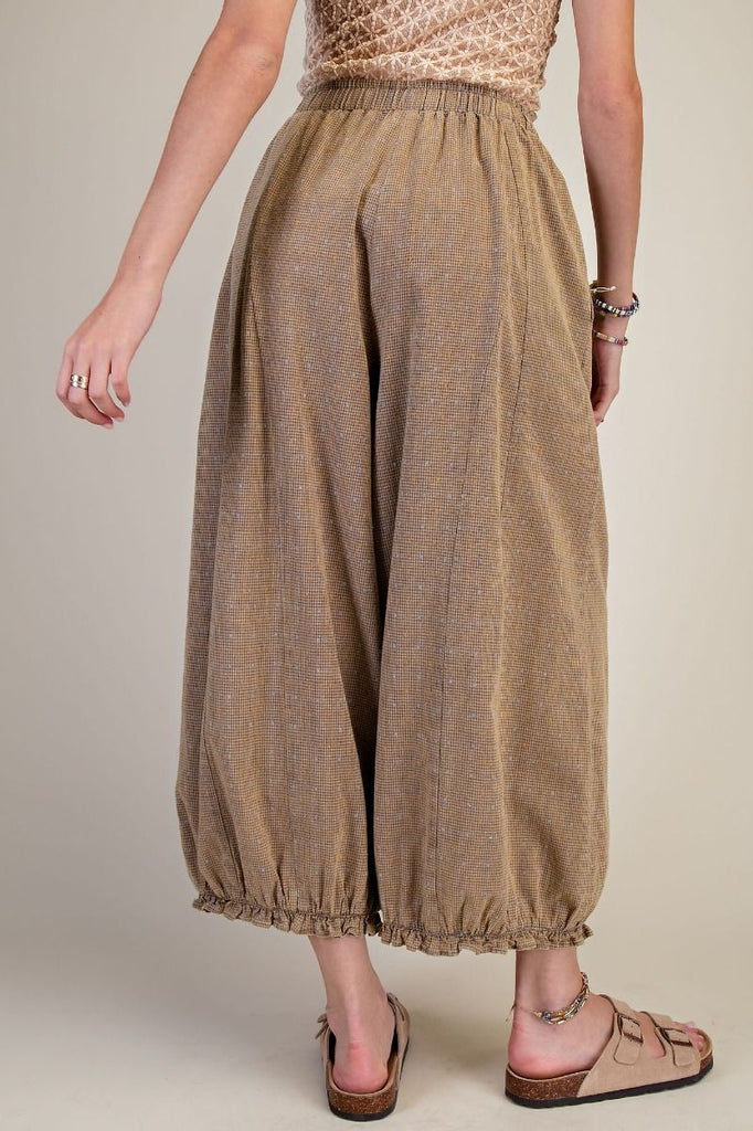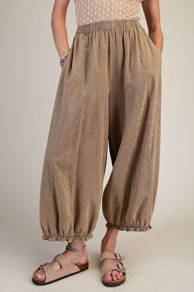 Embrace effortless comfort in these Be Free Pants, featuring a breezy mineral-washed rayon linen blend perfect for laid-back days. The loose harem silhouette with a wide leg drapes beautifully, while the elastic high waistband and ankle cuffs ensure a relaxed fit. Subtle micro-checkered pattern adds visual interest without fuss. Practical side pockets keep essentials within reach. Ideal as part of a matching lounge set or styled solo for that easy, coastal-inspired aesthetic.