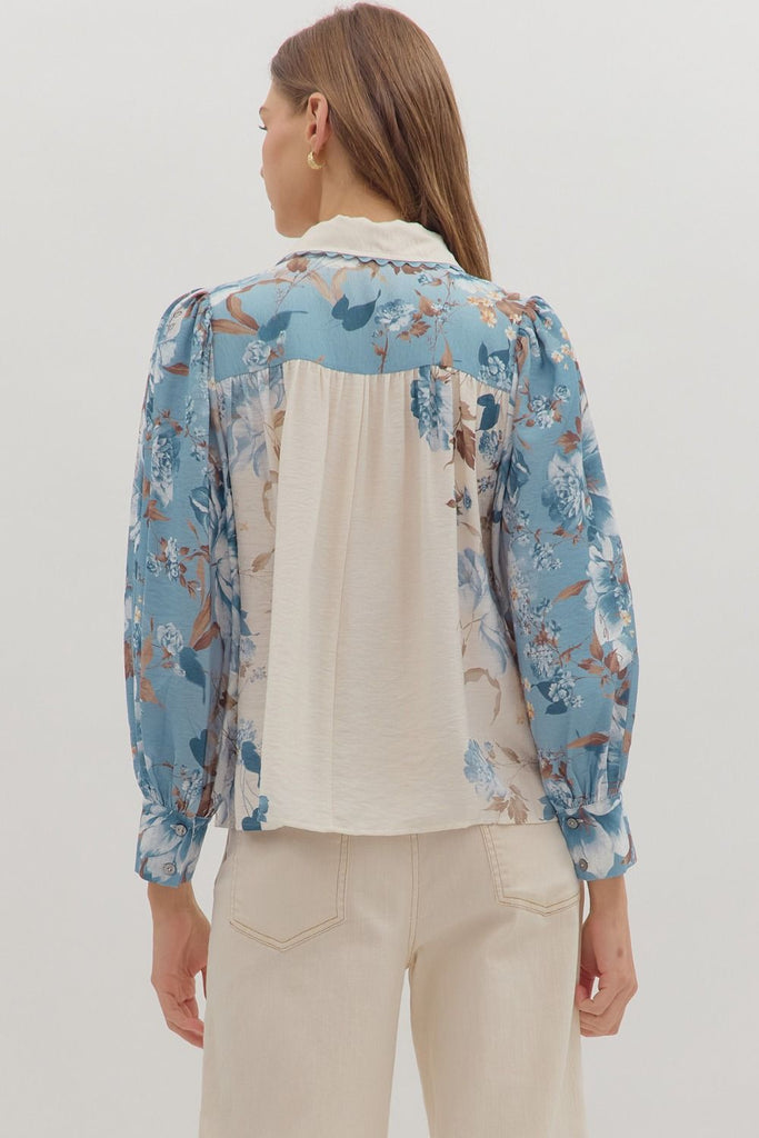 The Blue Waters Top captures the essence of beachy fall style with its lightweight, woven fabric and delicate floral print. Designed with long sleeves and a button-up front, it features scallop trim along the collar and placket for a subtle, stylish detail. Unlined and non-sheer, this airy top offers comfortable wear perfect for layering on crisp coastal days.