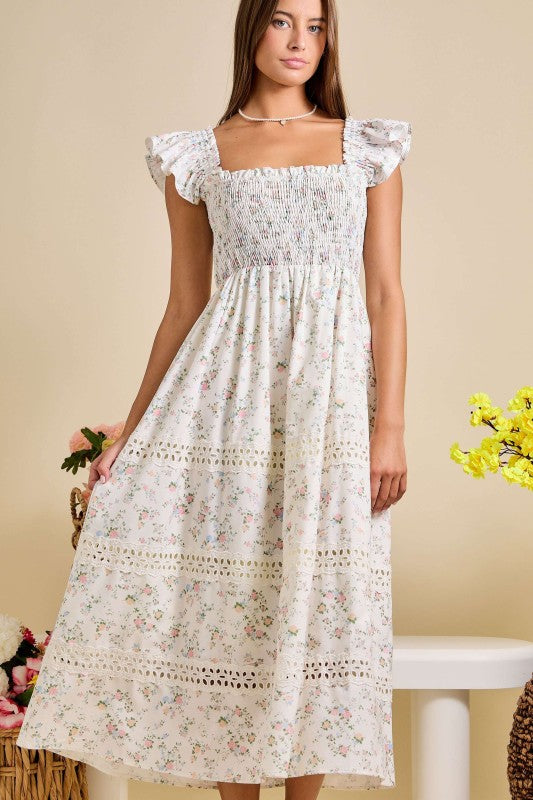 Embrace effortless elegance with the Fancy Florals Dress, a romantic maxi designed for those sun-soaked moments. Crafted from lightweight fabric adorned with delicate all-over florals, this piece features a charming smocked bodice, square neckline, and flutter sleeves that dance with movement. The flowing silhouette extends to midi-to-maxi length with subtle lace panel accents for added sophistication. Whether you're attending a garden party, destination wedding, or weekend getaway, this versatile sundress brings coastal-inspired femininity to your spring and summer wardrobe.