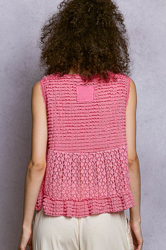 This breezy lace top brings effortless charm to your warm-weather wardrobe. The V-neckline and sleeveless design keep you cool on sunny days, while the cropped silhouette pairs perfectly with high-waisted denim or flowing skirts. Delicate trim detail and a pointed solid pattern add subtle texture that catches the light beautifully. Whether you're strolling the boardwalk or meeting friends for sunset drinks, this versatile piece transitions seamlessly from beach to bistro with laid-back style.