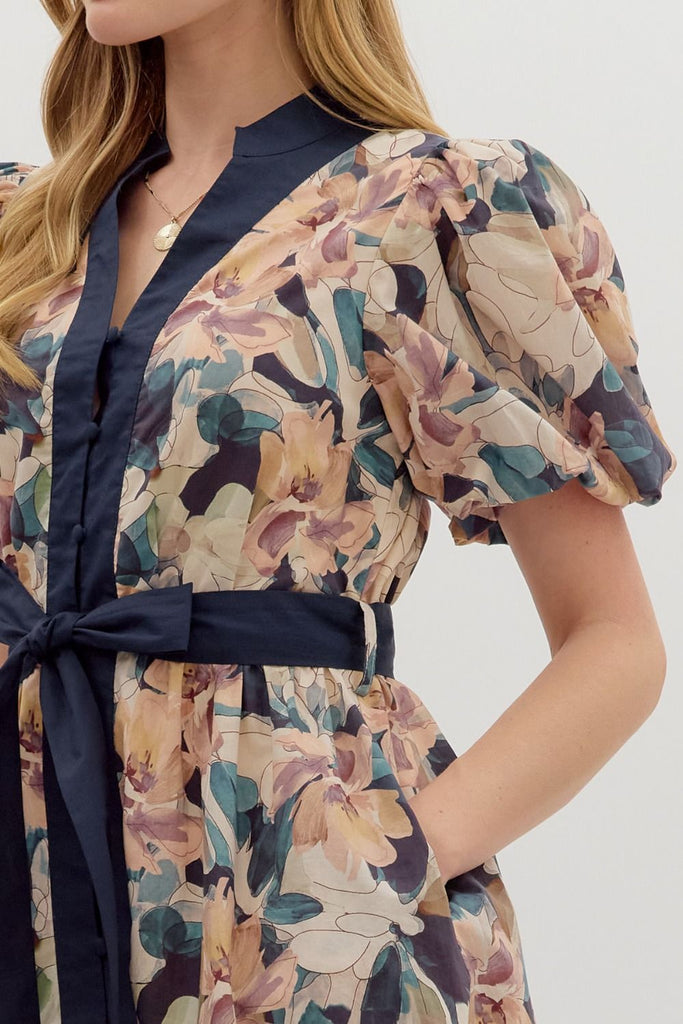 Step into springtime fun with the Magnolia Bloom Dress! This playful mini dress features charming short bubble sleeves and a floral pattern that brightens any day. The contrast band collar and front button closure add a touch of whimsy, while the elasticated back waist and removable belt let you customize your fit. Lightweight and fully lined, it offers comfort and coverage, plus handy side pockets for your essentials. Perfect for twirling through sunny afternoons or casual outings with friends.