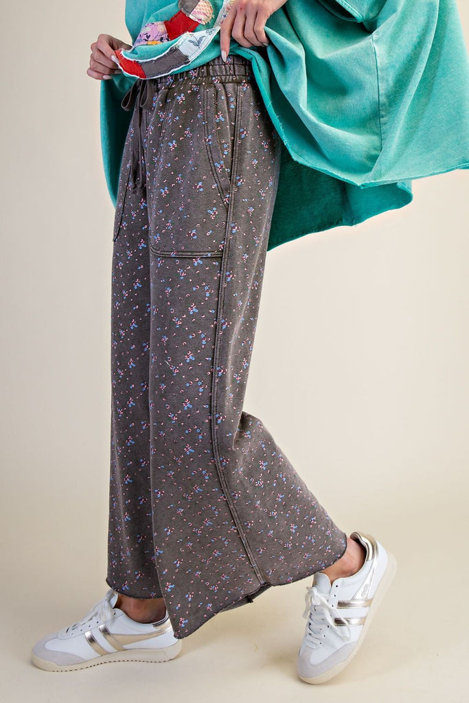Effortlessly chic and undeniably comfortable, these floral print washed terry pants are your new go-to for laid-back days. The relaxed wide-leg silhouette pairs perfectly with the all-over mini floral print, while the stretchy French terry fabric moves with you. Features include an elasticized waistband with drawstring for an adjustable fit, functional side pockets, and a cropped length that hits just right. Mineral washed for that perfectly lived-in feel, these pants bring an easy, breezy vibe to any casual wardrobe.