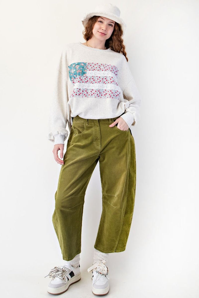 Embrace cozy vibes with the Patching To Make Whole Sweatshirt, featuring a relaxed, oversized fit perfect for laid-back days. Its round neckline with ribbed trim adds comfort, while the standout patchwork American flag design brings a playful twist. Floral prints and delicate eyelet lace details add unexpected charm, making this pullover a fun and stylish way to show your spirit.