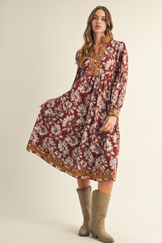 Embrace autumn elegance with the Sunset Meadows Dress. This 100% cotton midi dress features long sleeves and a charming ruffled neckline, perfect for cooler days. Side pockets add practicality, while the solid contrast accent enhances its floral design, making it a versatile choice for fall outings.