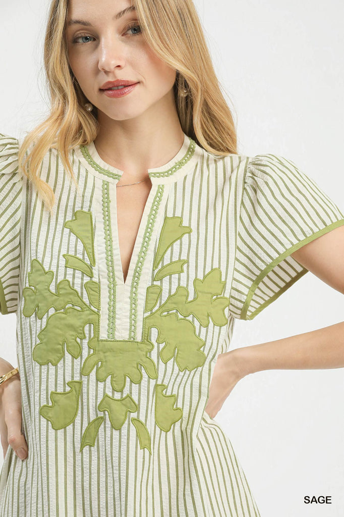 You Are Good for Me Dress features a charming pinstripe pattern with a split V-neck accented by delicate scalloped trim. Short flutter sleeves trimmed in piped edge add a flirty touch, while contrast trim details and applique accents bring personality to every angle. Unlined for breathable comfort, this dress is perfect for anyone who loves vintage-inspired style with a modern twist.