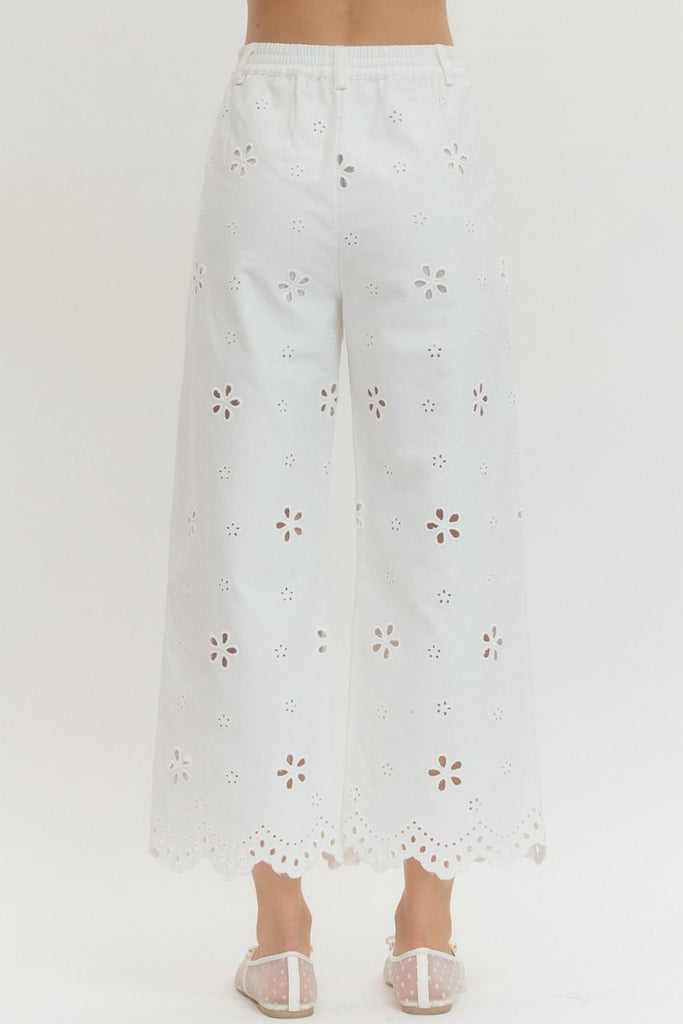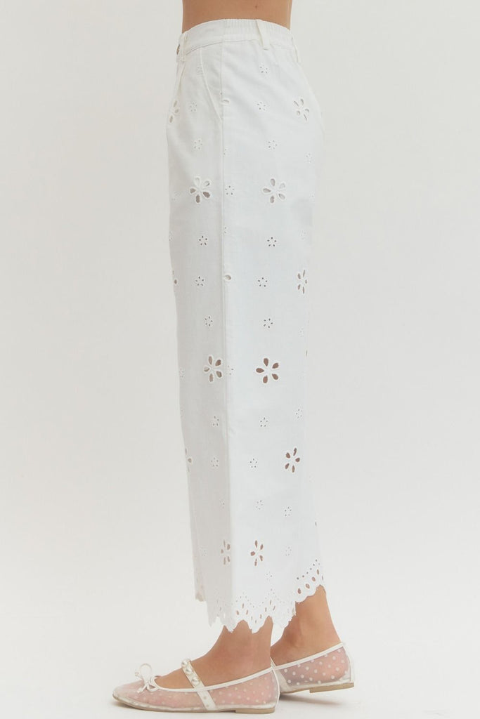 Introducing the Eyelet Everything Pant—your new go-to for effortless style! These lightweight woven pants feature delicate eyelet embroidery that adds a charming, feminine touch. The wide-leg silhouette flows beautifully, while the scalloped hem detail keeps things playful and on-trend. Designed for comfort with an elasticized back waist and side pockets, plus a lined construction that ensures you stay covered. The zip-fly with button closure keeps everything secure. Perfect for dressing up or down, these non-sheer pants are your ticket to looking put-together all season long.\