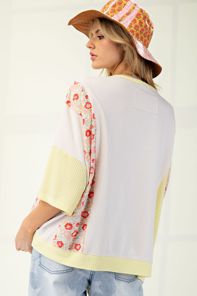 Effortlessly cool, the Bright Signs Top is a must-have for any fashion-forward wardrobe. Made from soft washed terry knit, this pullover features a unique mix of prints and patches, including a bold raised peace patch on the front. The 3/4 sleeves and relaxed fit offer comfort and style in one. (Peace out in style).