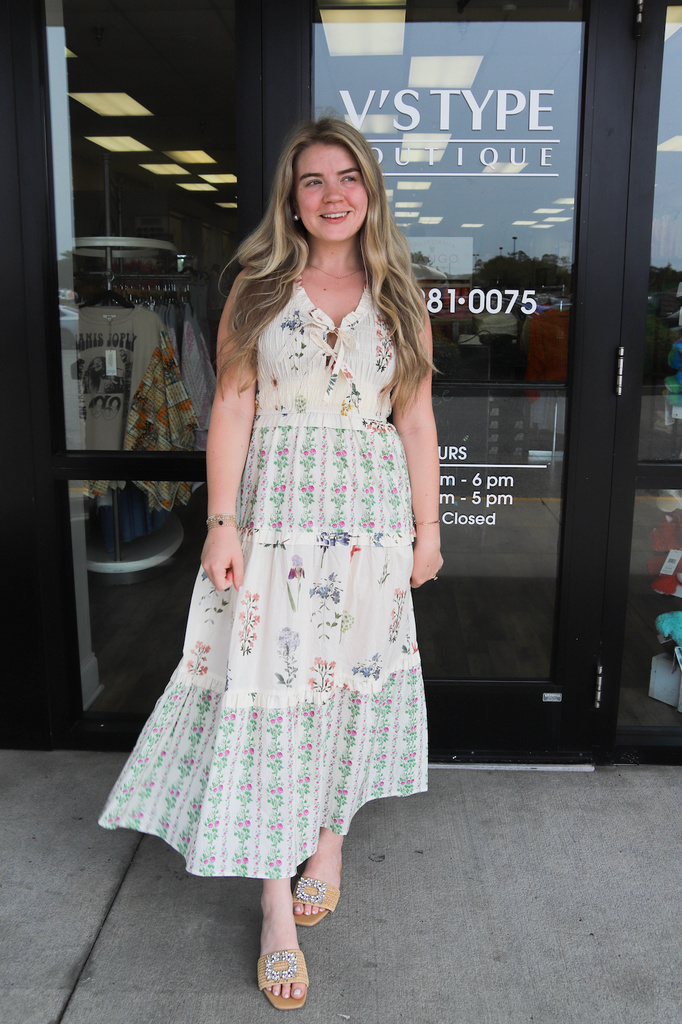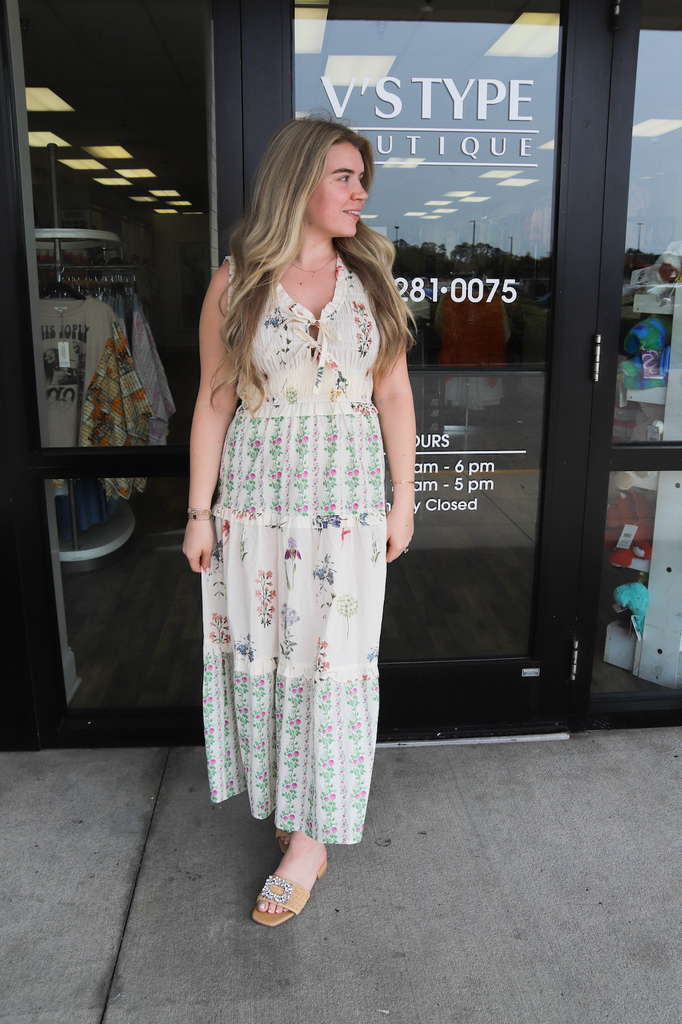 Dress to impress with the Meadow Moments Dress. This versatile midi dress features a playful multi-floral print that will turn heads. The ruffle accents and tiered sleeveless design add a touch of whimsy, while the smocked top and V-neck bow tie closure provide a flattering fit. With pockets and a lightweight, lined construction, this dress is both stylish and practical.