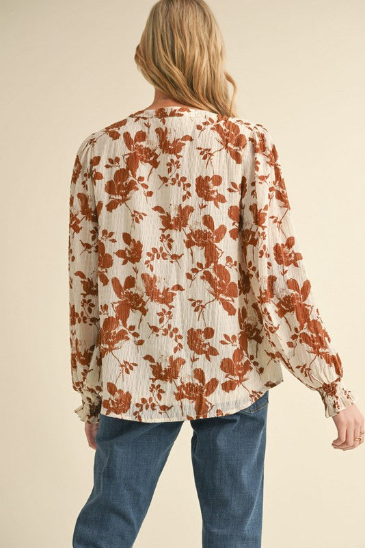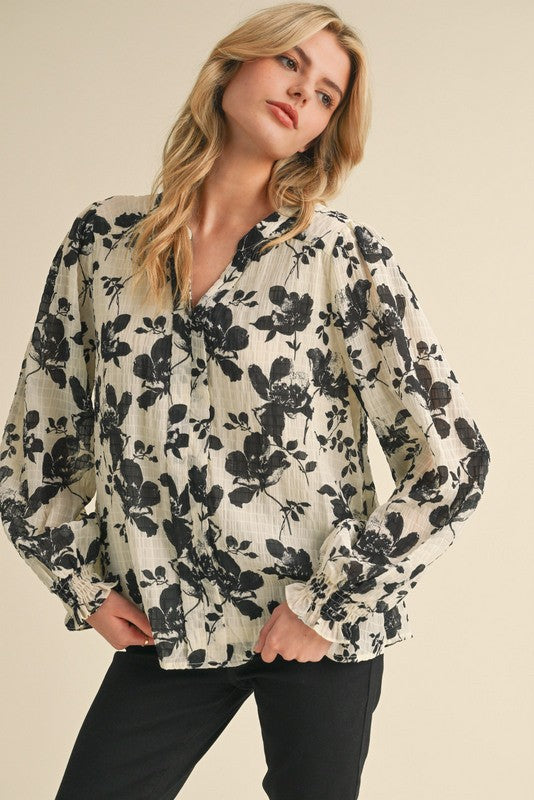 Floral print top with slit neck, front point detail, and long poet sleeves. - Non-sheer, lightweight.