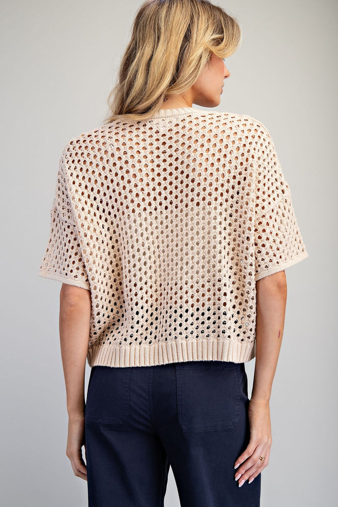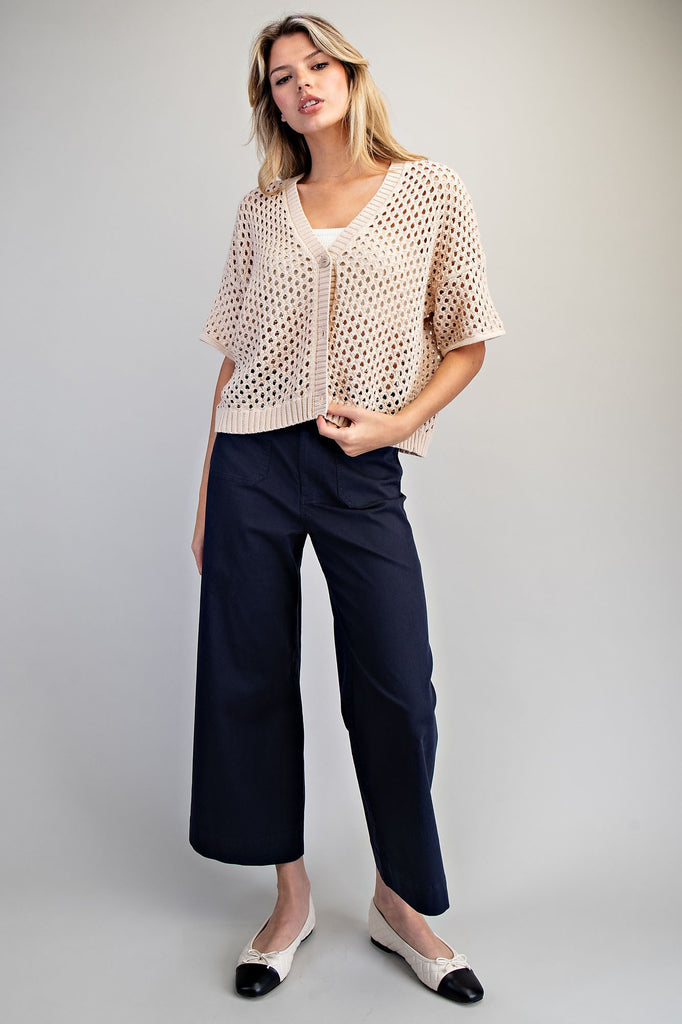 Elevate your warm-weather wardrobe with this textured button-down cardigan, designed for effortless layering. The open knit crochet pattern delivers exceptional breathability, making it ideal for hot days when you need a lightweight cover-up. Short sleeves and a relaxed silhouette provide comfort without compromise, while ribbed trim at the V-neckline and hem creates a polished finish. Full button-down front closure allows you to wear it open as a statement piece or buttoned for added coverage. Perfect for transitioning from day to evening, this versatile layer pairs seamlessly with everything from casual basics to dressed-up pieces.