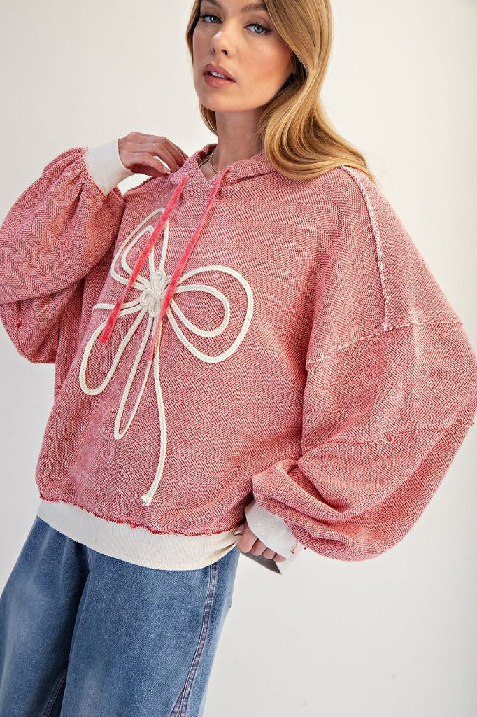 The Just Add A Bow Top features a relaxed, boxy fit with dropped shoulders for a playful, effortless look. Made from textured herringbone fabric, it includes an attached hood with drawstrings and a standout raised rope bow embroidery that adds a charming detail to your casual style. Perfect for adding a fun twist to your everyday wardrobe.
