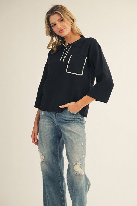 Bring a fun twist to your wardrobe with this playful 3/4 sleeve polo sweater top. Featuring a charming chest pocket edged with delicate pearl accents, it adds a touch of whimsy to casual style. Perfect for days when you want to feel comfy yet effortlessly chic.
