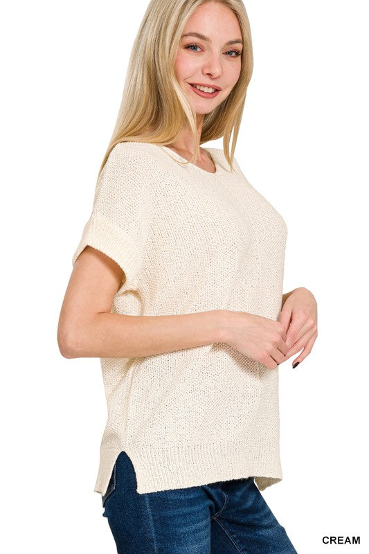 Effortless comfort meets laid-back style with this center seam short sleeve sweater. Crafted with a relaxed fit and finished with practical side slits, it's the perfect piece for easy layering or wearing solo. The understated design works beautifully with everything in your wardrobe, from casual jeans to flowing linen pants. Simply the best choice for those breezy days when you want something soft, versatile, and undeniably cool.