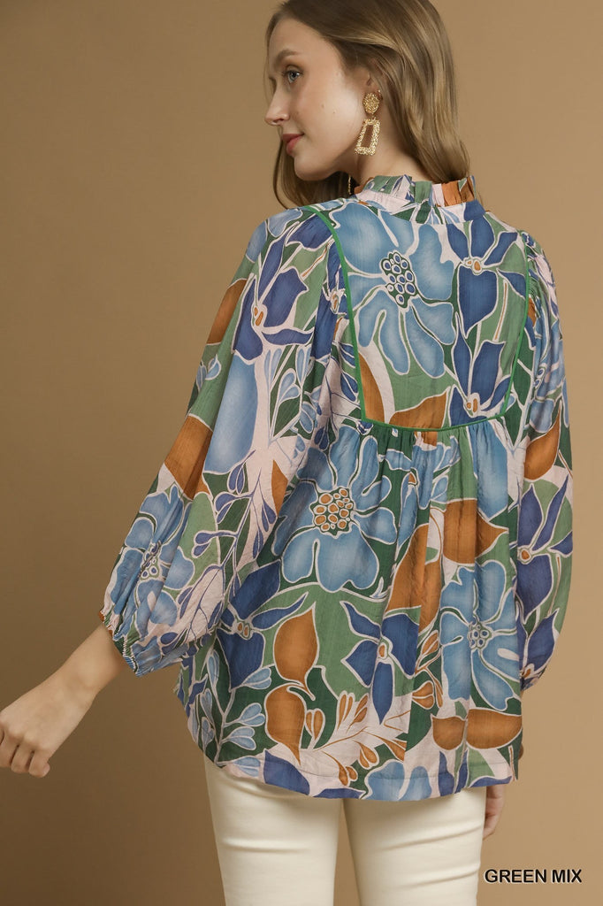 Brighten your wardrobe with the Another One For Kim Top, featuring a lively multicolor abstract floral print. Its playful split V-neck with delicate ruffle trim adds a flirty touch, while long balloon sleeves with elastic cuffs create a fun, breezy silhouette. The flowy, relaxed fit ensures all-day comfort, complemented by chic contrast piping and a smooth lining for a polished finish. Perfect for adding a splash of color and charm to any outfit!