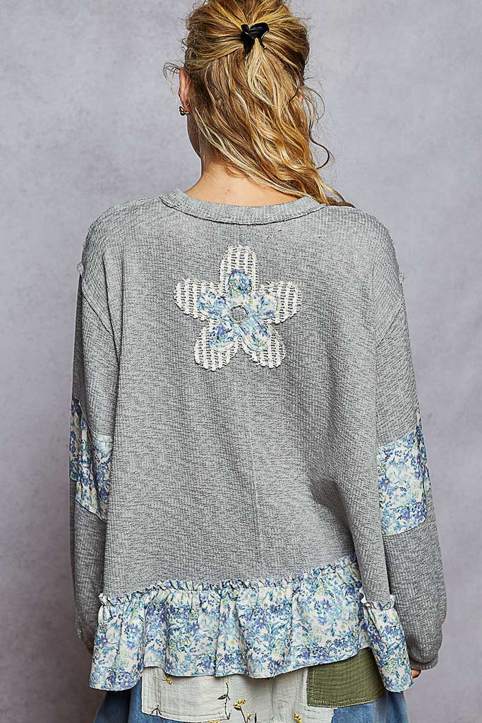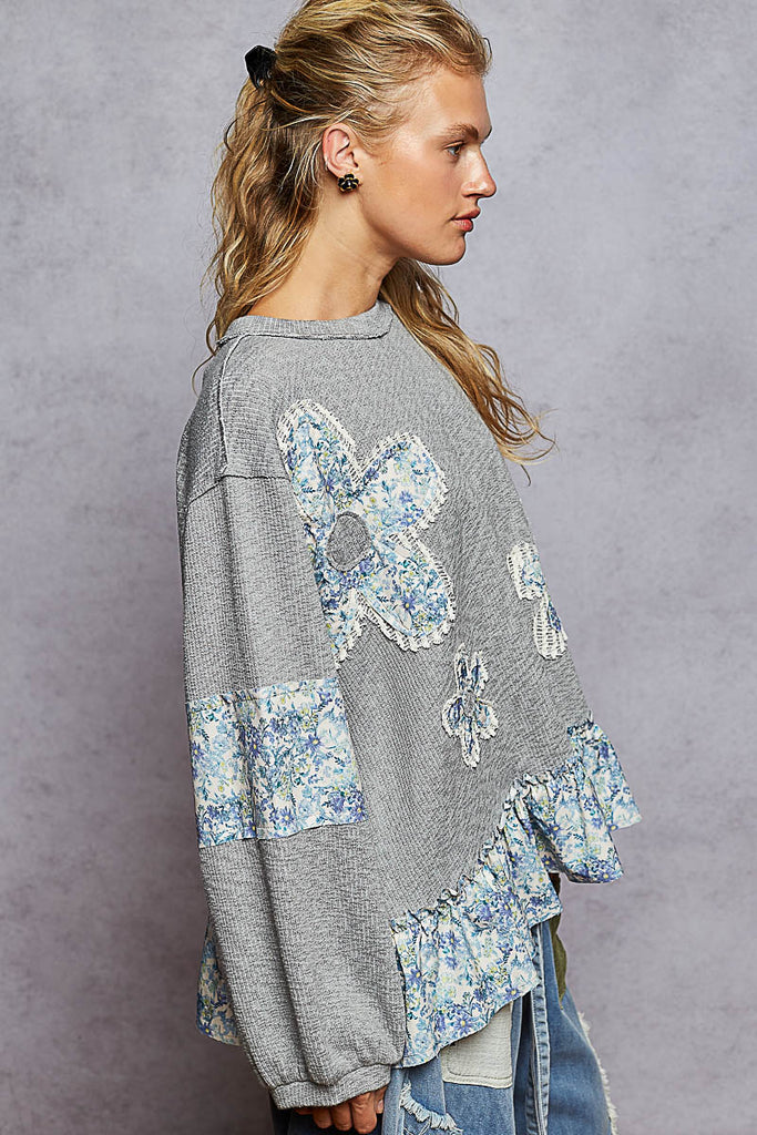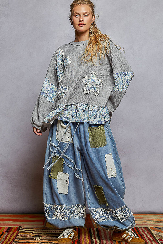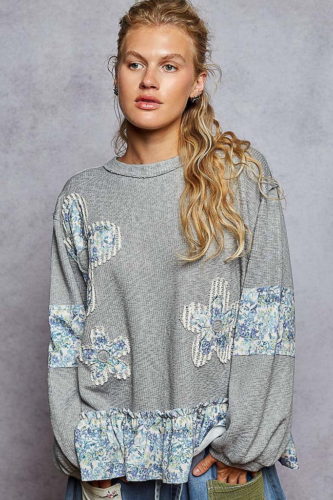 Bring a playful touch to your wardrobe with the Blueberry Cobbler Top. This relaxed fit, round neck tee features balloon sleeves and charming flower patches with prints on crochet fabric. The cut-and-sew rib detail, ruffles, and raw edges add whimsical flair, while the solid color keeps it versatile. Perfect for everyday fun, it's designed for easy care with normal washing.
