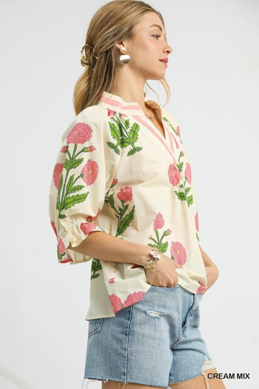 The Breezy Elegance Top features a charming floral print and a playful V-notch neckline with contrast trim. Its 3/4 puff sleeves end in elastic ruffle cuffs, adding a flirty touch to your look. Lightweight and unlined, this top keeps things breezy and fun for any casual outing.