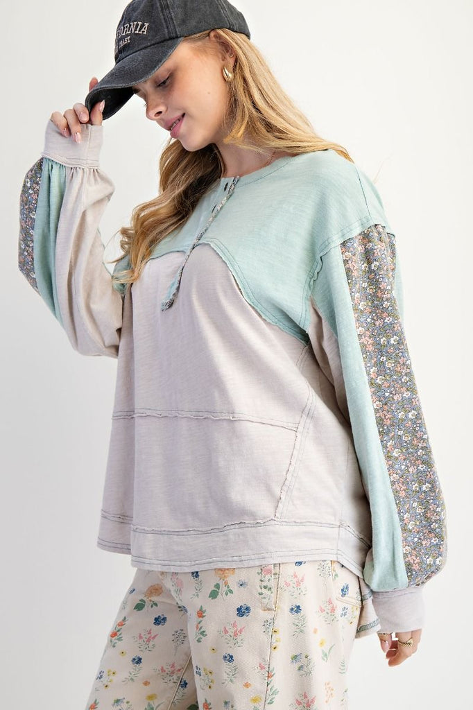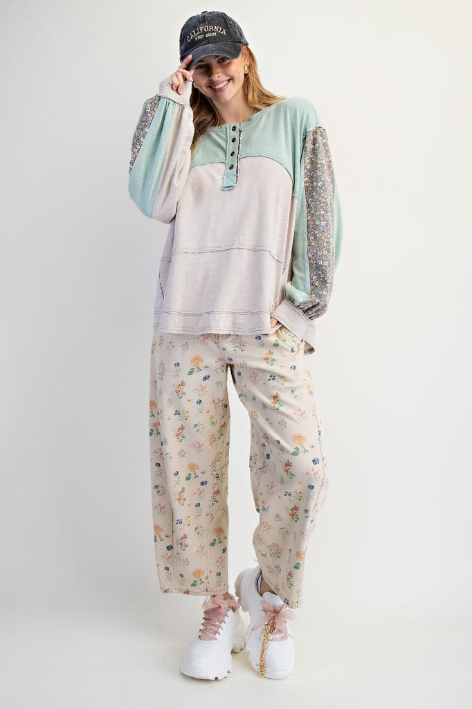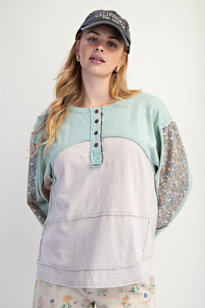 The Cool Brisk Air Top brings fun to your wardrobe with its color-blocked button front and charming floral ditsy print panels. Featuring a front half placket, curved hemline, and raw edge detailing, this top offers a playful twist on classic style. Its loose, relaxed fit and slightly dropped shoulders make it perfect for easygoing days filled with comfort and cheer.