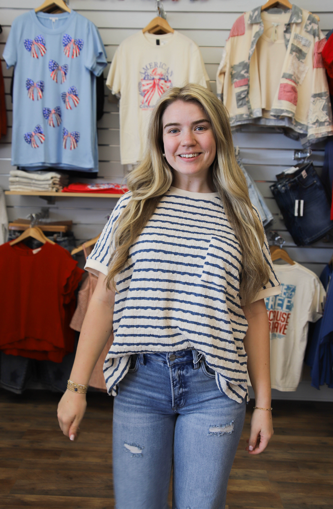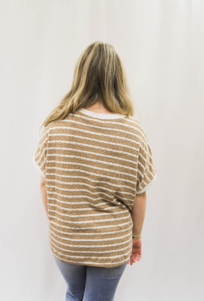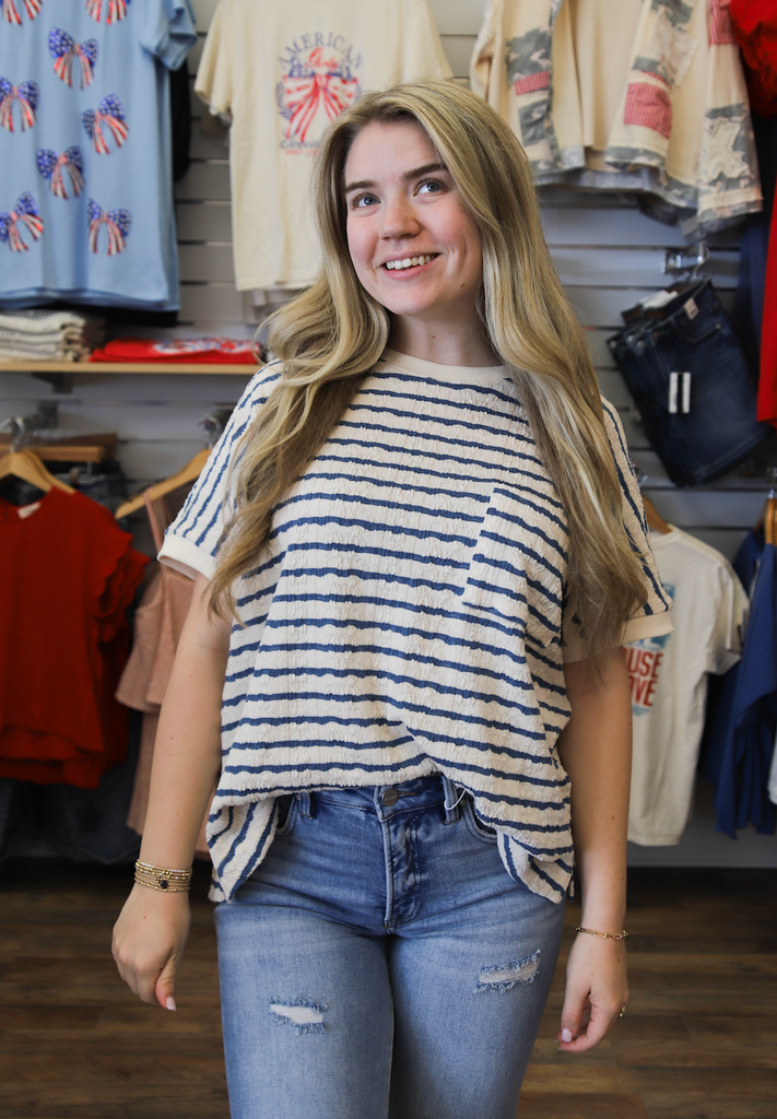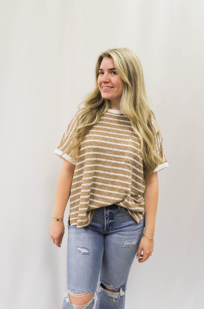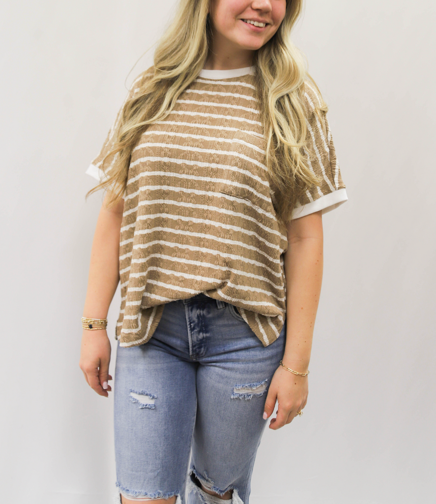 Don't just do the most, look the most in our Doing The Most Top. With textured stripes, a front chest pocket, side slits, ribbed band sleeves and neckline, and a boxy silhouette, this top is perfect for a relaxed and loose fit. Available in a knit fabric.