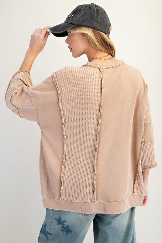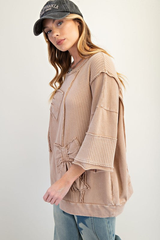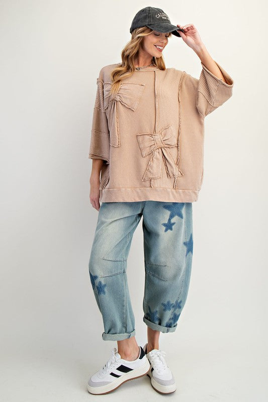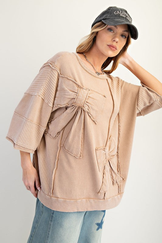 Dive into comfort with our Everything Is Good Top! This mineral-washed terry tunic features whimsical asymmetrical patchwork and playful bow details that'll make you smile. With cozy dropped shoulders, 3/4 sleeves, and exposed seams, this oversized top brings effortless style to your casual wardrobe. Perfect for those days when everything really is good!