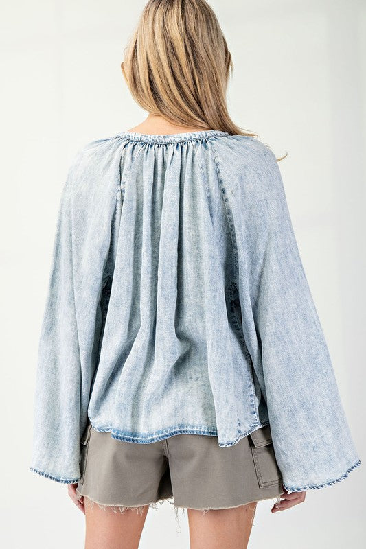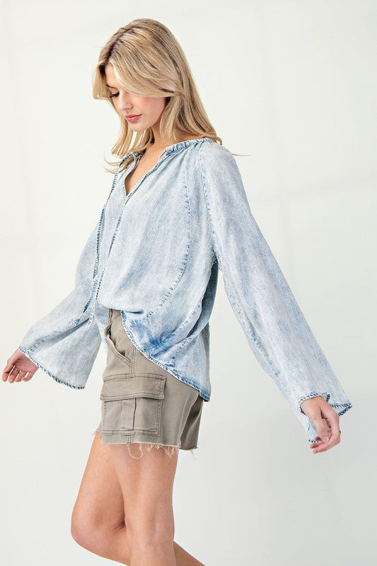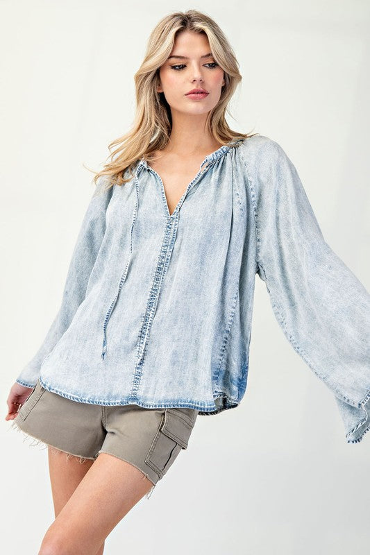 Embrace effortless charm with the Floating Light Top. This mineral-washed blouse features a playful V-neckline with a front tie drawstring and flirty bell sleeves. The pinched back adds a touch of detail, while the flowy fabric keeps you comfortable and breezy all day long. Perfect for adding a light, whimsical vibe to any outfit!