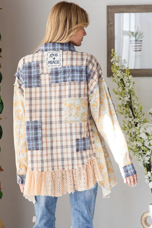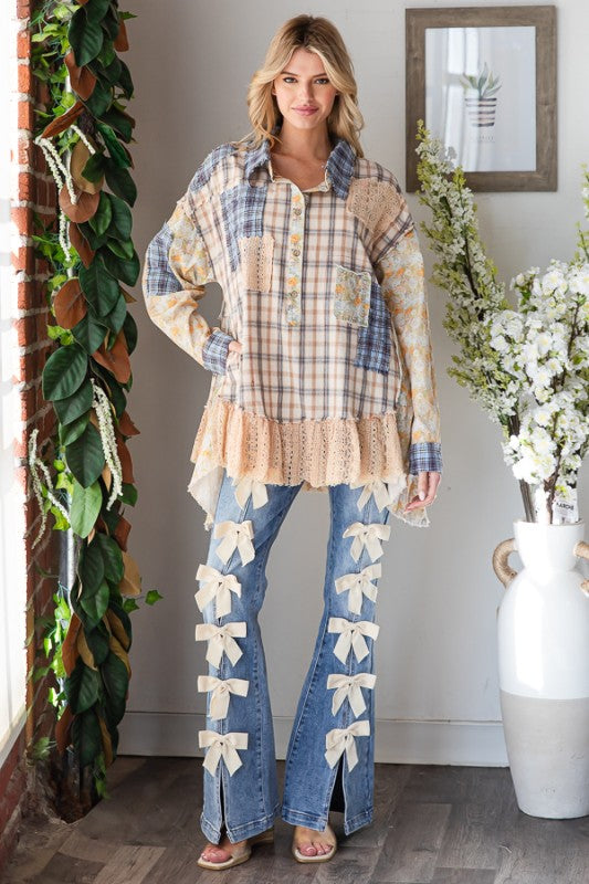 This Flower and Lace Top brings a playful twist to classic plaid with a mineral wash for a lived-in vibe. Featuring a relaxed, oversized fit and charming ruffle lace hem, it’s perfect for adding flirty flair to your everyday look. Imported and effortlessly cool, it's the ideal shirt to dress up or down!