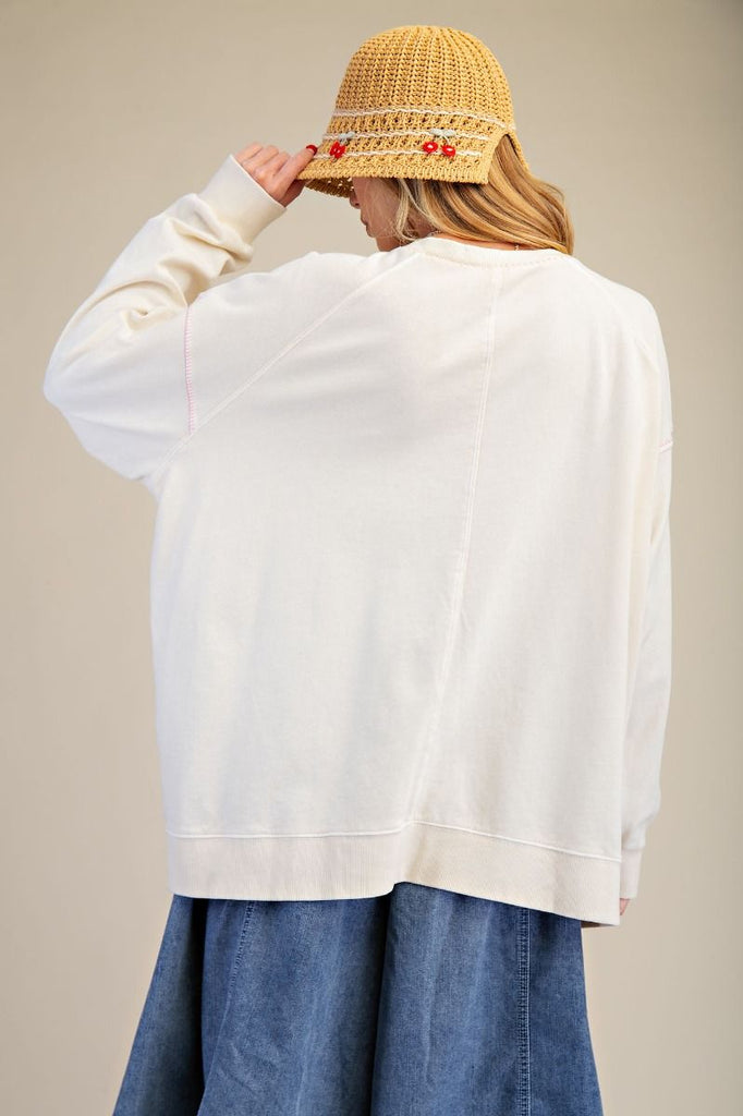 I Ain't Coming Back Top is your new favorite pullover. This mineral-washed terry piece features a boxy, relaxed fit with a star-shaped patch front showcasing lemon and floral prints. Exposed stitching adds playful character, while ribbed cuffs, hem, and side slits complete the look. Crew neckline rounds out this effortlessly cool essential.