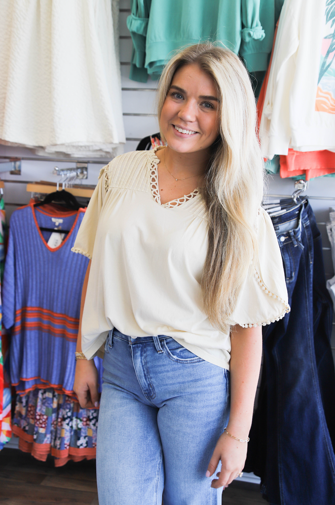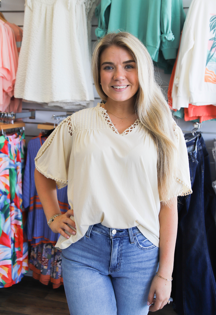 Embrace effortless style with the Just Coasting Top, featuring a playful V neckline and a relaxed fit that feels like a gentle breeze. Mineral washed for a soft, lived-in look, this top is adorned with delicate crochet lace and charming pintucked pleats, adding a touch of whimsy to your everyday wardrobe. Perfect for those easygoing days when comfort meets cute.