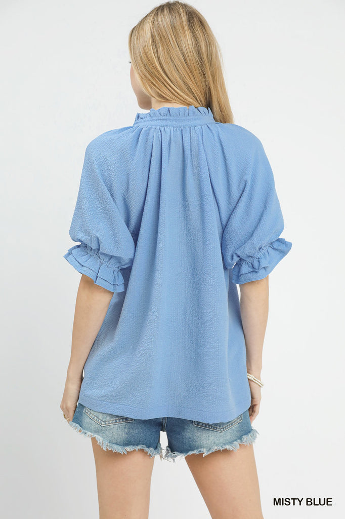 Embrace your playful side in this charming seersucker top that's all about feminine details. The split neckline frames a delicate ruffle collar, while short puff sleeves with ruched ruffle cuffs add a flirty touch. Crafted in textured seersucker fabric, this unlined piece is perfect for warm-weather styling with its breezy, effortless vibe. A modern take on vintage-inspired fashion that celebrates your fun, confident spirit.