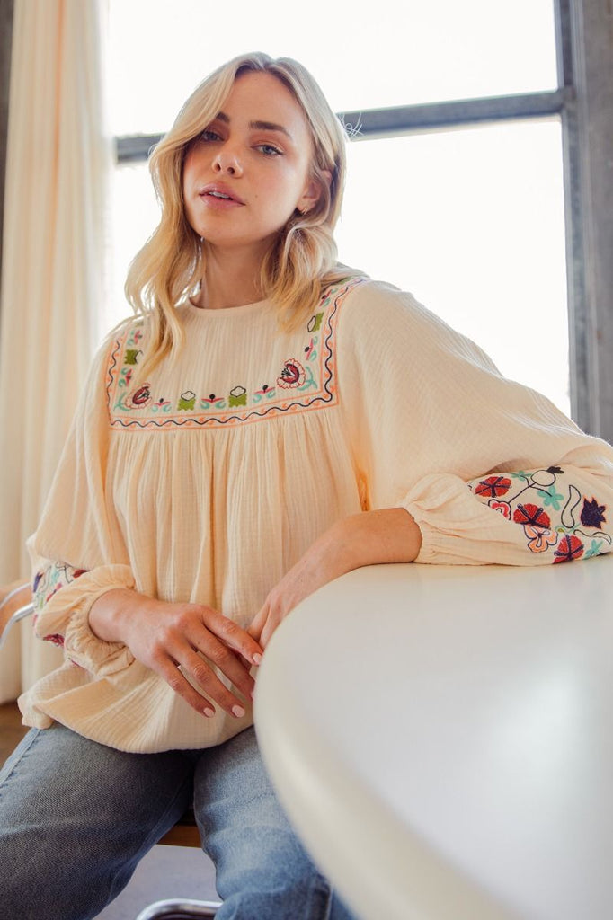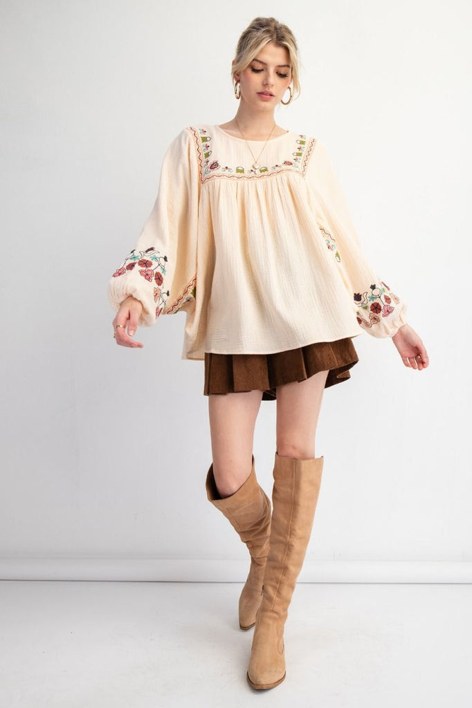 Embrace breezy comfort with the Lovin' The Gauze Top! This playful tunic features a rounded neckline and long batwing sleeves with elastic cinched cuffs for a fun, flirty vibe. Dropped shoulders and a ruched panel add unique charm, while delicate floral embroidery brings a touch of whimsy. Its relaxed, loose fit and flowy silhouette make it perfect for effortless style on any day.