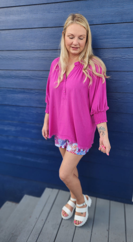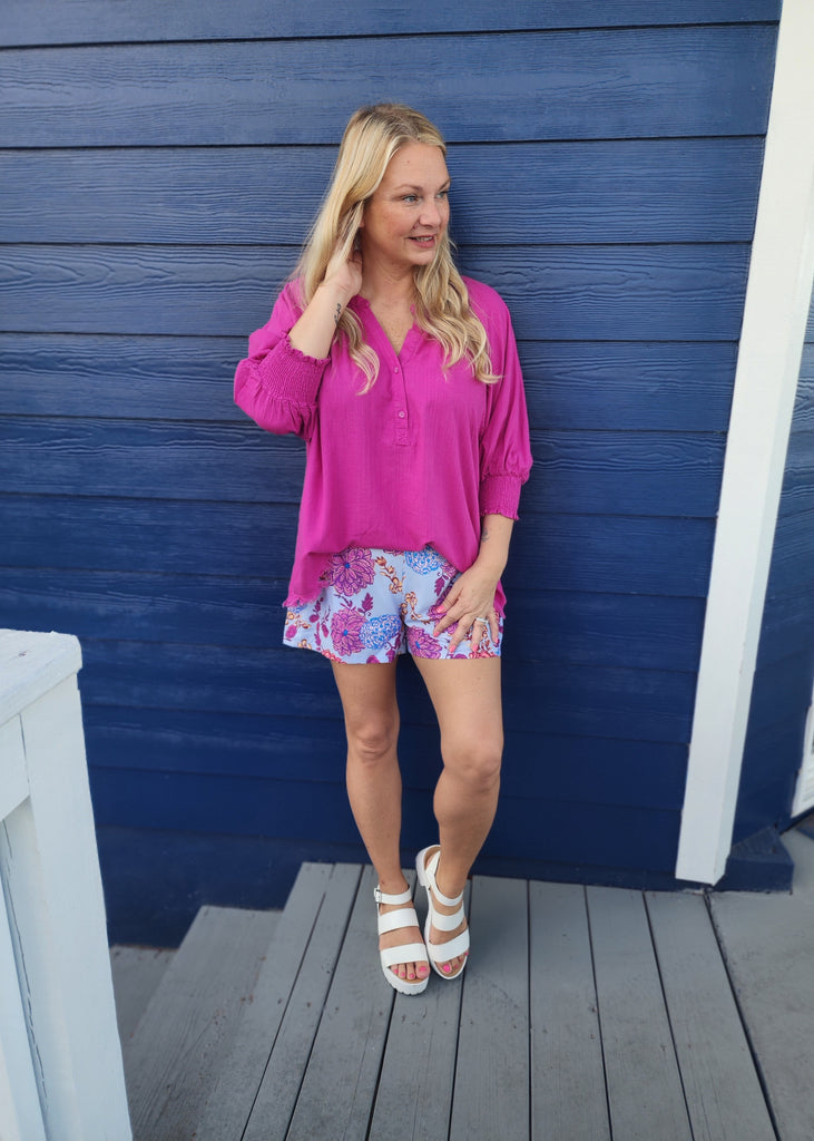 Linen Boxy Cut Split Neck Top with Short Raglan Sleeve Top, Not Lined 55% Linen 45% Cotton Model wearing Large, Paired with Floral n fun Shorts