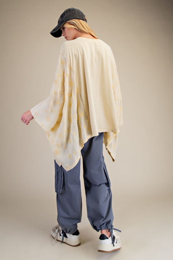 Embrace laid-back vibes with this Peace of Cake Top, a relaxed poncho-style piece that's all about comfort and cool. Featuring a patchwork peace sign design across the front, textured fabric, and embroidered details, it's a statement maker with personality. The oversized silhouette drapes beautifully with flowy sides and batwing sleeves, while the rounded neckline keeps things effortlessly chic. Perfect for those who want their wardrobe to reflect their peaceful, playful spirit.