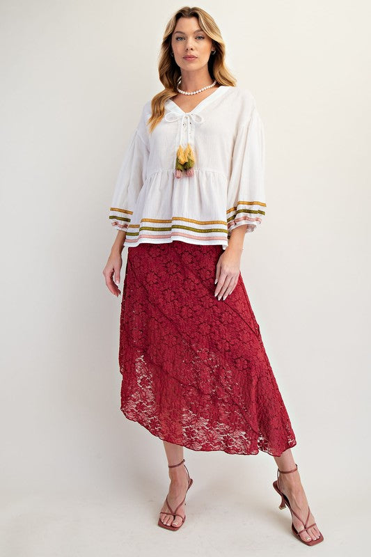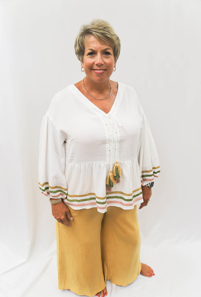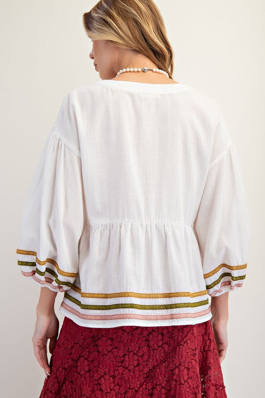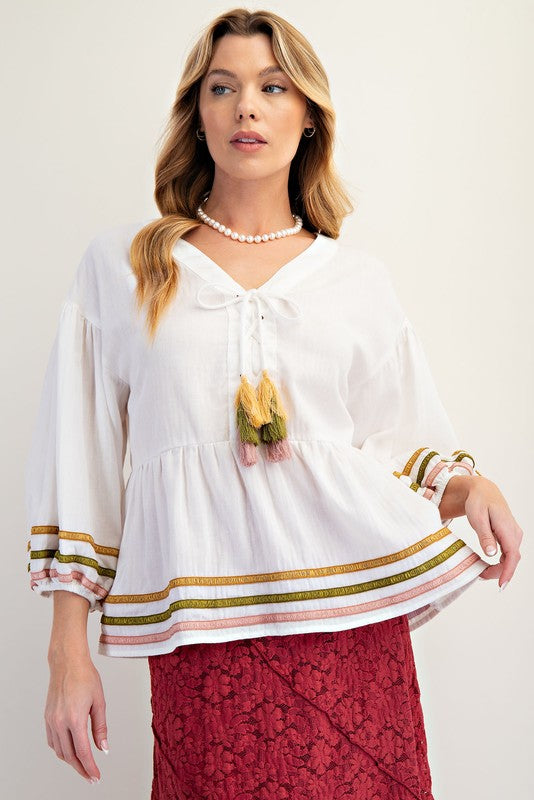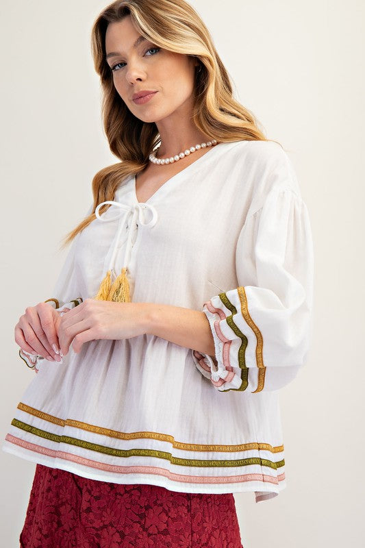Embrace effortless charm with the Peasantly Surprised Top! Featuring playful 3/4 puff sleeves and a relaxed fit, this tunic delights with a crossed tassel tie at the V-neck and colorful embroidered trim along the hem and sleeves. The lightweight fabric and ruffled bottom add a breezy, whimsical touch perfect for sunny days or casual outings.