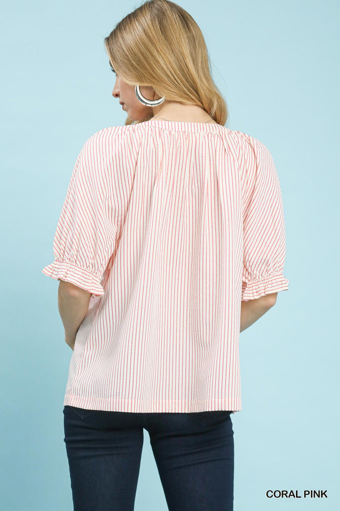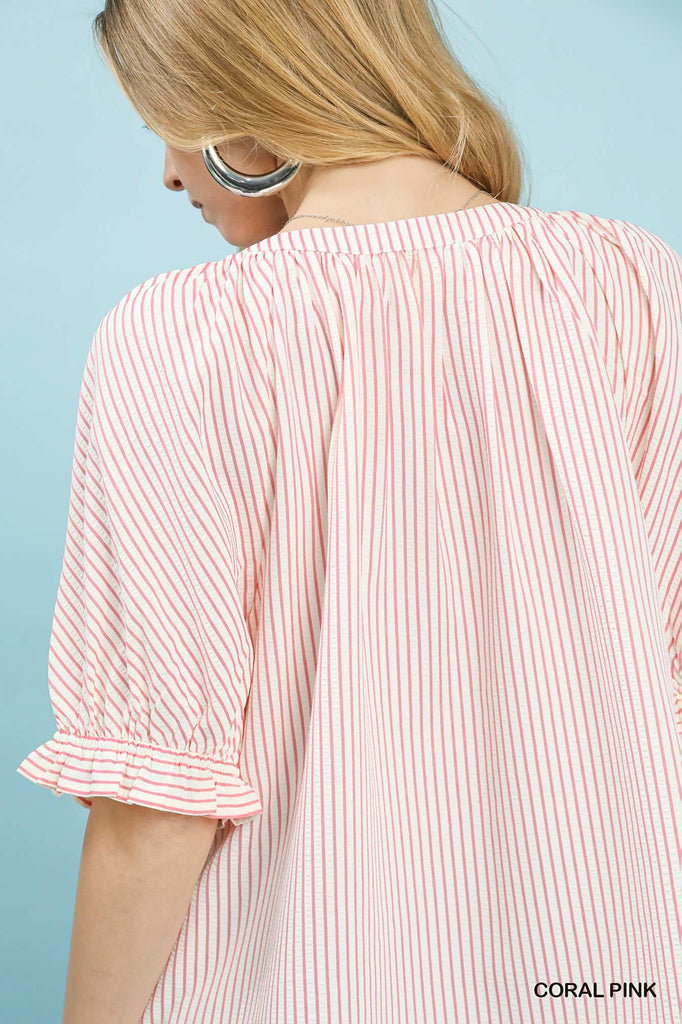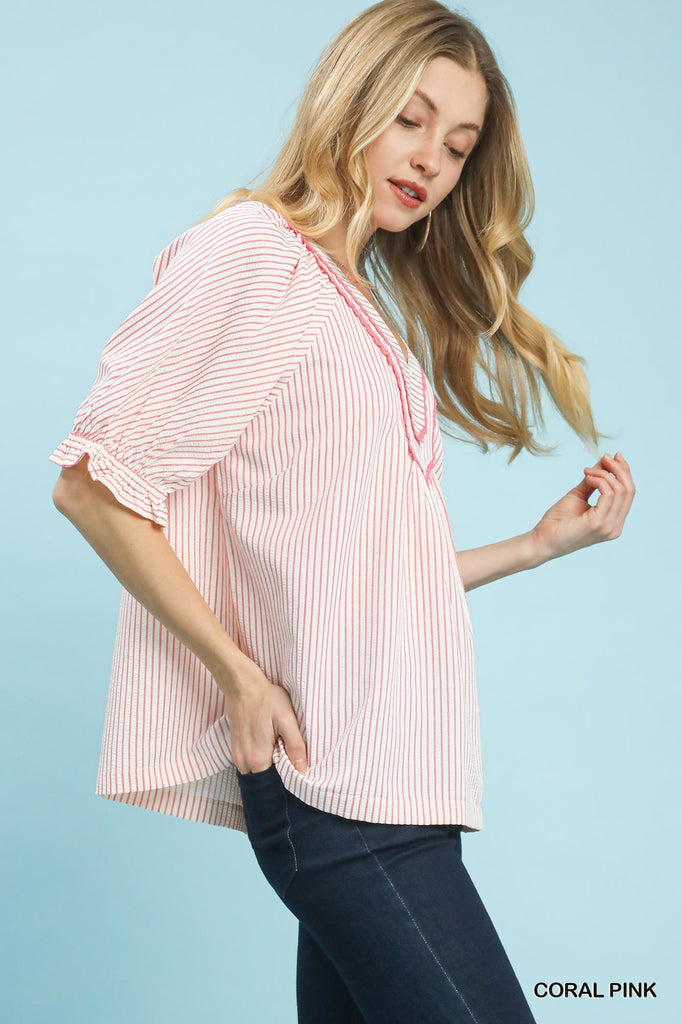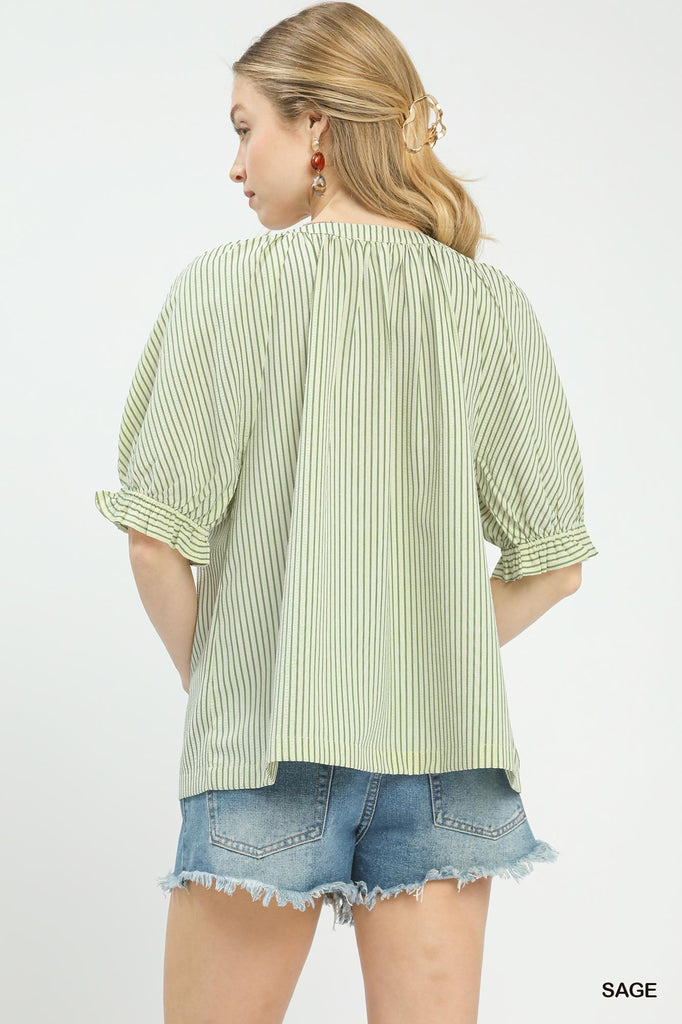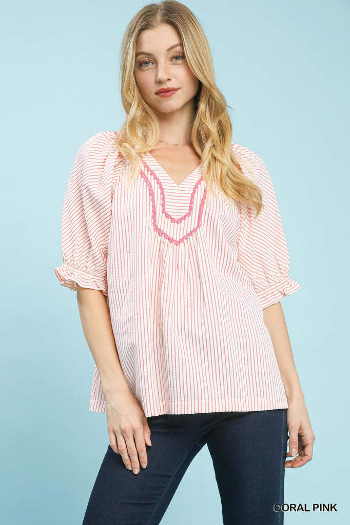 Effortless coastal charm meets everyday style with this striped V-neck top. Featuring delicate short puff sleeves and feminine lace trim accents, it's designed for relaxed sophistication. The unlined construction keeps things light and breathable, perfect for warm weather layering or standalone wear. A versatile piece that transitions seamlessly from casual days to breezy evenings.