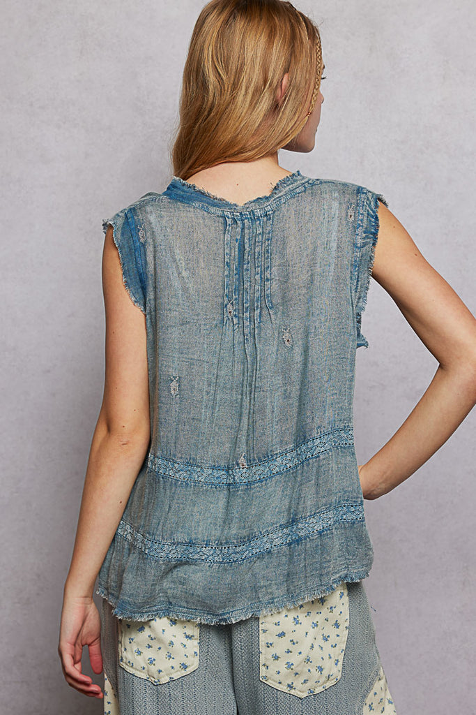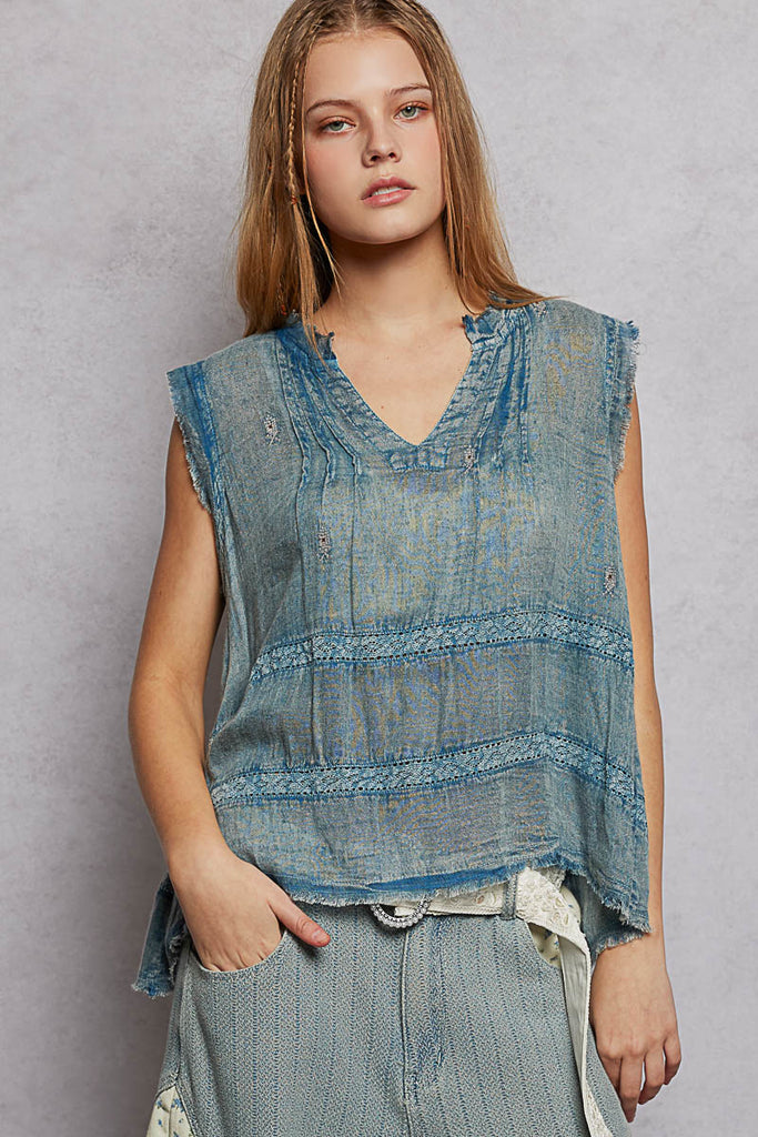 Effortlessly chic and undeniably adorable, this V-neck sleeveless top brings vintage vibes to your everyday rotation. Crafted from soft cotton with a relaxed fit that feels like a dream, it features delicate pintuck detailing, charming lace trim, and intricate embroidery that catches every eye. The vintage wash gives it that perfectly lived-in look you've been craving. Throw it on with your favorite jeans or dress it up—this top is your new go-to for looking put-together without even trying.