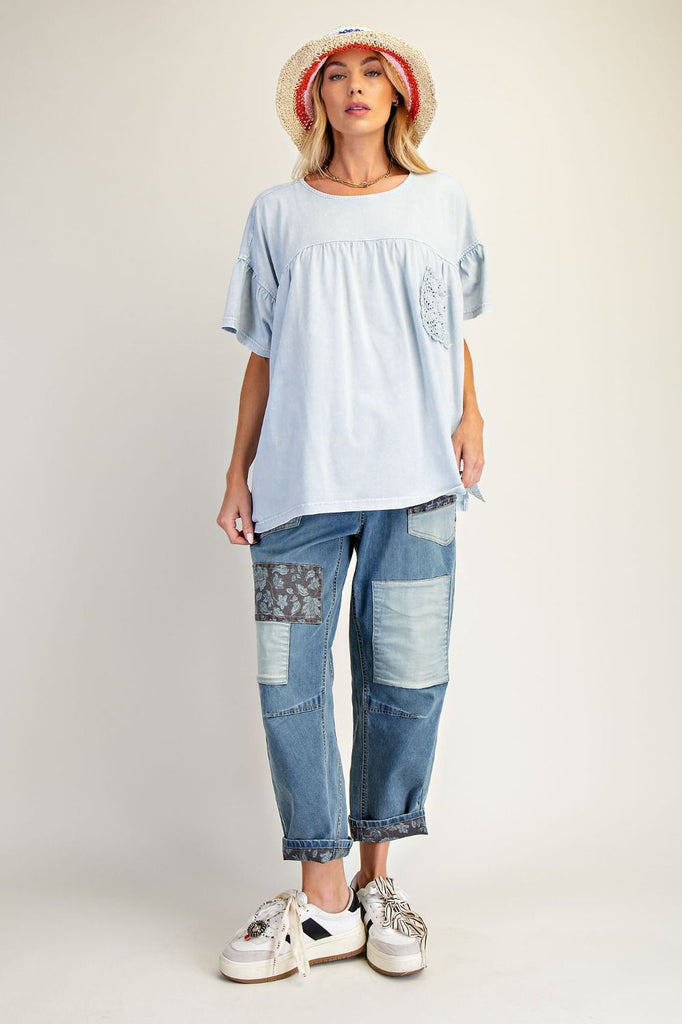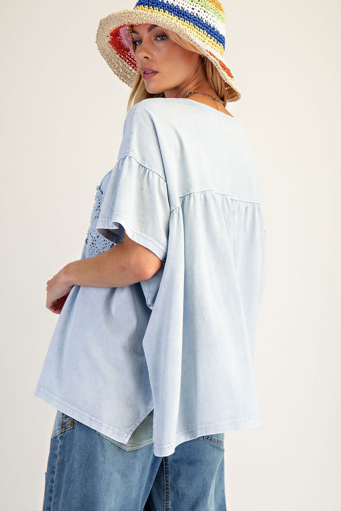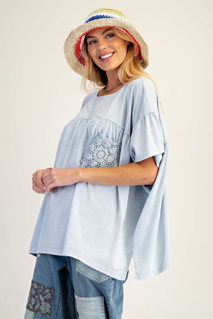 Slip into pure comfort with our Soft As Clouds Top—a mineral-washed cotton dream that feels as good as it looks. Featuring relaxed dolman sleeves and a loose, easy fit, this laid-back layer is perfect for those days when style meets zero effort. The rounded neckline and charming crochet embroidery chest pocket add just the right touch of personality. Whether you're lounging or running errands, this effortlessly cool top is your new go-to favorite.