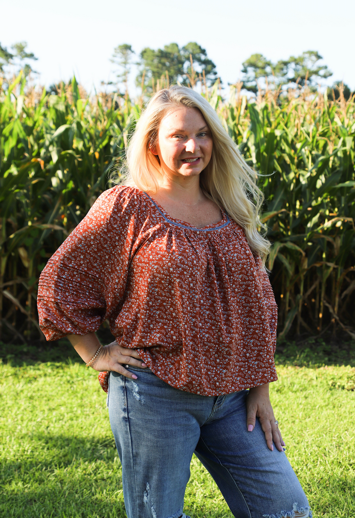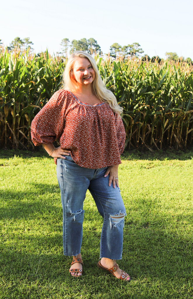 Add a touch of whimsy to your wardrobe with this Something On My Mind Top. Featuring a delicate floral print and playful 3/4 length elastic cuffs, this square neck blouse will elevate any outfit with its poet sleeve look.
