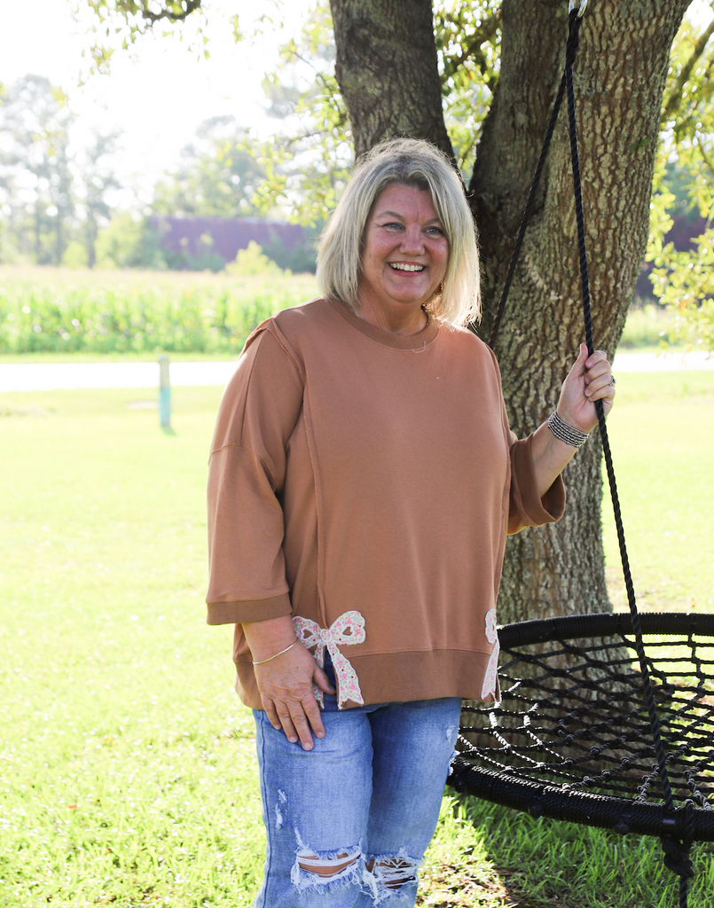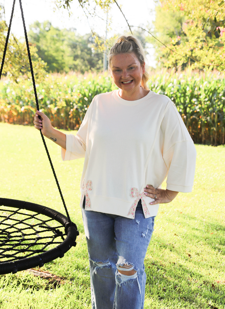 Embrace cozy charm with the Split Ends Top, featuring an oversized, relaxed fit and a soft mineral-washed terry fabric. Its round crew neckline and dropped shoulders add effortless style, while playful floral bow appliques at the bottom hem bring a fun, feminine touch. Side slits beneath the bows add movement and flair, making this pullover perfect for laid-back days with a twist.
