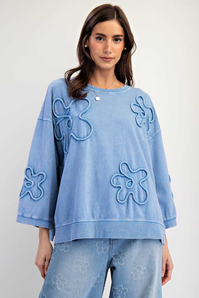 Unleash your playful side with our Stitched Petals Top. This flower patch mineral washed terry knit pullover features 3/4 sleeves, raised flower patchwork in front, ribbed band hem and cuffs, side slits, and a boxy silhouette for a relaxed and loose fit.
