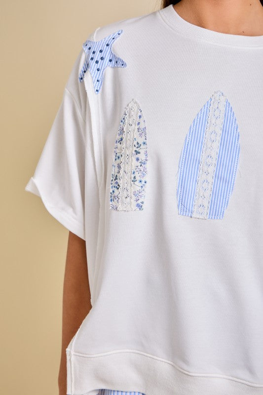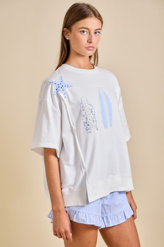 Catch the waves in style with our Surfing Life Top. This relaxed oversized tee features soft cotton fabric and eye-catching appliqué surfboards in striped and floral patchwork, complete with playful starfish accents that capture that breezy seaside spirit. Effortlessly versatile, it pairs beautifully with shorts or denim for laid-back beach days and summer lounging. Whether you're packing for a coastal getaway or building your summer capsule wardrobe, this fun statement piece brings authentic surf culture and resort-ready charm to every warm-weather occasion.