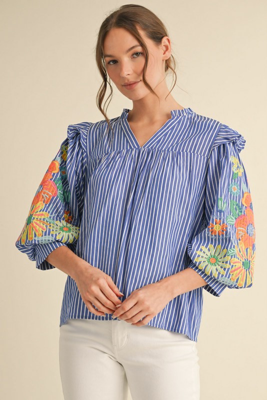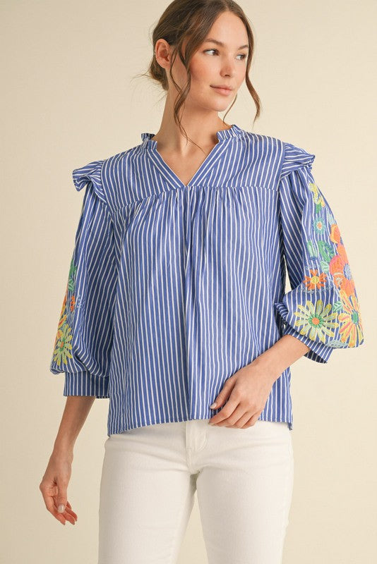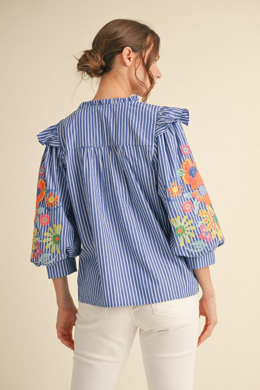 Add a touch of spring to your wardrobe with this playful top! Featuring stripes, a frilled neck, and ruffly trimming, this top is full of fun details. The three-quarter peasant sleeves with embroidered flowers add a charming touch. Perfect for any occasion!
